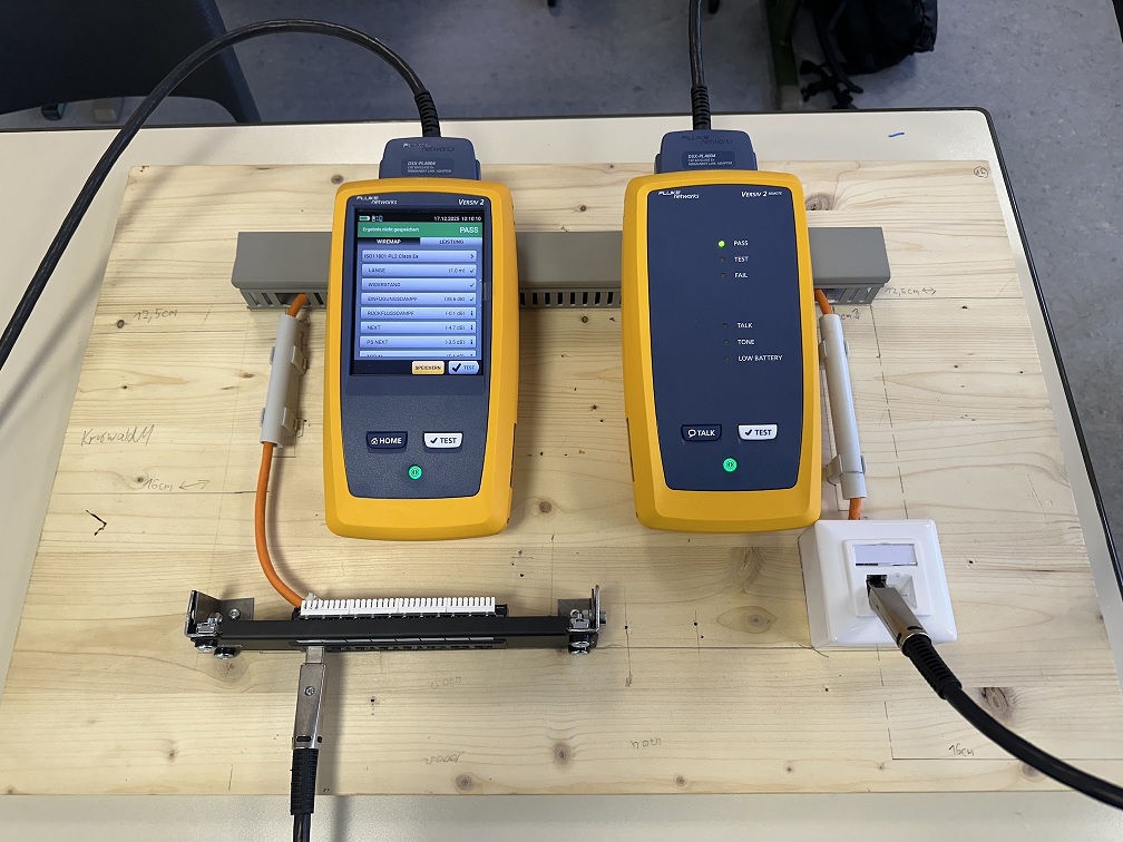 Abschließend überprüften die Lernenden die Funktionsfähigkeit ihrer Installation. Dank der neu angeschafften Fluke-Messgeräte konnten sie erstmals mit professionellen Prüfverfahren arbeiten, wie sie auch in der Industrie üblich sind. Die automatisierten Testabläufe zeigten anschaulich, wie Leitungslängen, Dämpfungswerte und Verdrahtungsfehler erkannt und dokumentiert werden.