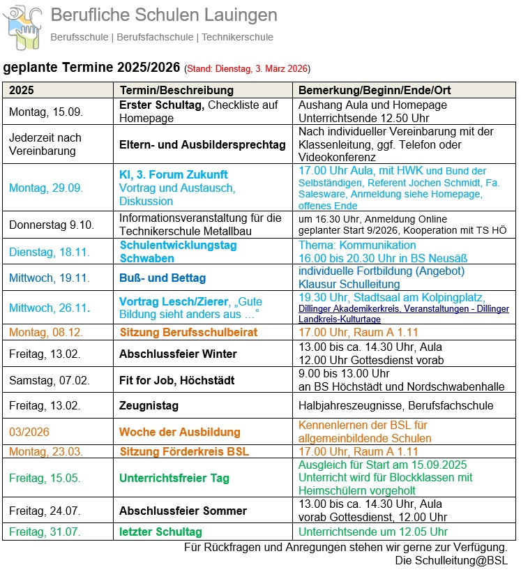 Erster Schultag im Schuljahr 2025/2026 ist an der Berufsschule Lauingen am Montag, 15.09.2025!
